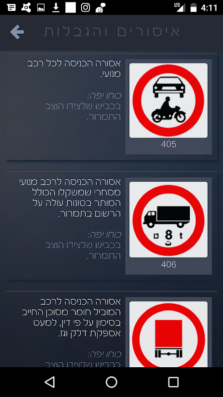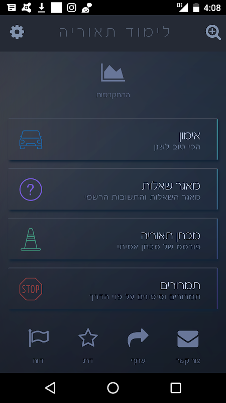 In addition to the training exercises – the application shows the graph of your training progress and grants you access to all of the questions that appear on the Ministry of Transport and Road Safety's official Q&A bank, divided into categories, road signs, simulations of the actual test format and the option to work on your errors.