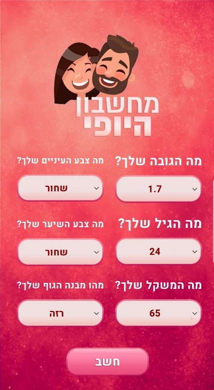מחשבון היופי שפיתחנו עבורכם, יחשב את רמת היופי שלכם בצורה מקצועית ואמיתית, ככה שתוכלו לדעת איפה אתם ממוקמים בסולם היופי בחברה הישראלית!