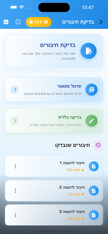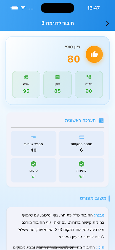 The application covers all the topics required for success in psychometrics in both chapters, English and verbal. Practice essential vocabulary in Hebrew and English that is common in the exam. Sharpen the ability to solve verbal analogies in the psychometric style, improve reading comprehension skills in Hebrew and English with passages and questions that simulate the exam level, and master the required English skills such as sentence completion and rewording in practice that simulates the psychometric. The application also includes verbal thinking practice and logic questions similar to those in the exam, and even offers a unique tool for preparing for the writing task (essay) using feedback based on advanced artificial intelligence (AI, similar to ChatGPT technology) to improve writing skills.