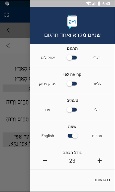 The app will present you with clear and easy-to-read verses and translation. In addition, you can choose between the translation of Onculus and Rashi and also your preferred way of reading: verse-verse or divided into ascents.