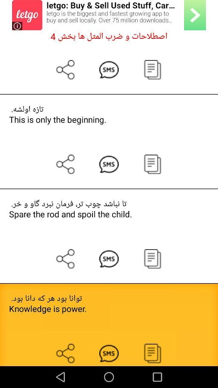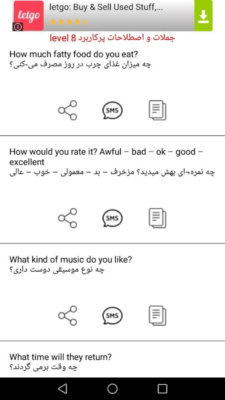 در این اپلیکیشن بر روی یادگیری لغات انگلیسی برای زبان فارسی و همچنین جملات انگلیسی (پرکاربرد ترین جملات زبان انگلیسی) و ضرب المثل های انگلیسی با ترجمه فارسی ، تمرکز کرده ایم. اموزش مکالمه زبان انگلیسی رایگان ، یکی از اهداف ما برای ساخت این نرم افزار بوده است.