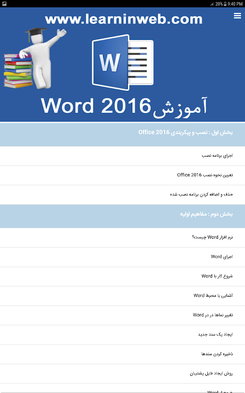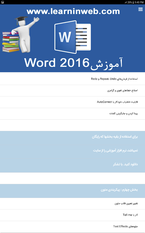 Learn Word 2016 interactively with voice and text in Persian, first few sections free