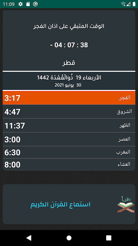 Qatar azan and prayer times / Holy Quran / Remembrances / Qibla direction