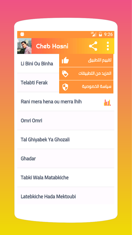 أغاني الشاب حسني بدون أنترنت - Cheb Hasni هو تطبيق من افضل تطبيقات الاغاني من اجل لاستماع الى أغاني الشاب حسني اذا كنت من مستمعين ومعجبين بأغاني الشاب حسني فهذ افضل تطبيق للفنان الشاب حسني فهذا التطبيق يضم تجميعة كبيرة ومميزة من اغاني الفنان الشاب حسني ان الاكتر تميزا في تطبيق أغاني الشاب حسني هو انه يشتغل بدون انترنت إذا ماذا تنتظر قم بتحميل تطبيق أغاني الشاب حسني واستمتع بافضل أغاني الشاب حسني المختارة بعناية من اجل ارضاء دوقك وايضا التطبيق مصمم ليكون بسيط الاستعمال وفعال في نفس الوقت وأيضا ذا منظر جميل ومريح للعين أرجو ان تستمتعوا بوقتكم مع تطبيقنا : أغاني الشاب حسني بدون أنترنت - Cheb Hasni