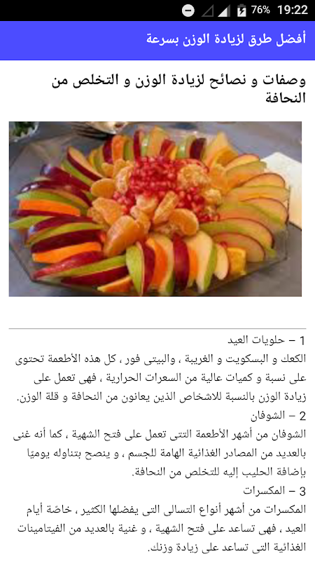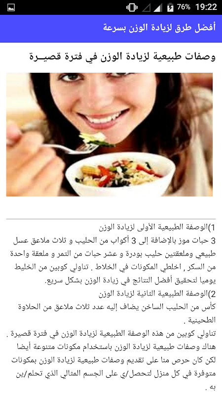يحتوي التطبيق على عدة وصفة لزيادة الوزن بسرعة بدون أنترنيت متجددة بستمرار و هذه بعضها :