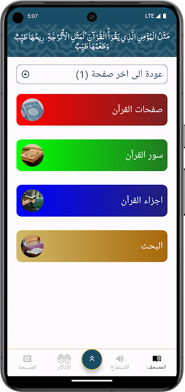 يستطيع المستخدم عبر تبويب "الاستماع" الاستماع لسور القرآن بشكل متتال وتشغيلها في الخلفية.