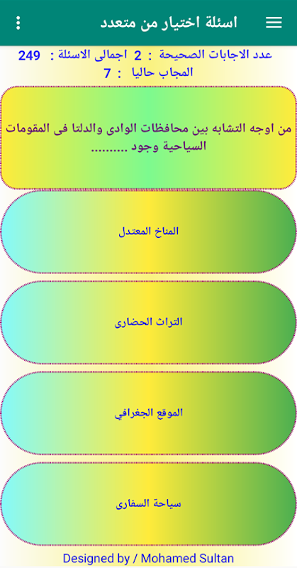 This application is for students of the first year of secondary school to train them on the tablet system and the modern system in the subject of geography, the second term intelligent questions and questions that depend on the students understanding and show the result at once this program is designed to serve high school students the modern system