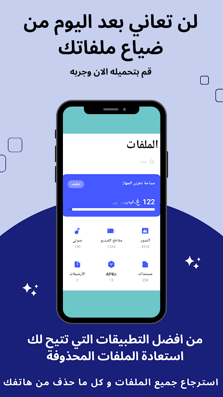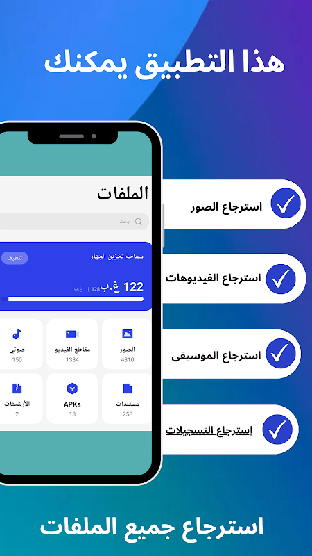 تم تصميم تطبيق استرجاع ملفات : صور فيديو صوت من اجل استرجاع كل صورك و فيديوهاتك و تسجيلات بطريقة منظمة تلقائيًا تسهّل استرجاعها