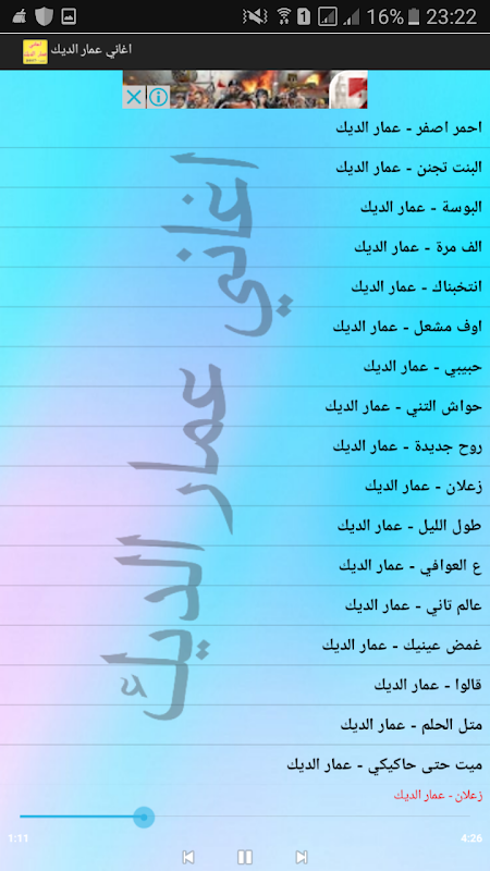لكل محبي الفنان السوري الكبير عمار الديك الدي ينتمي لعائلة الديك الفنية حسين الديك و علي الديك اليكم تطبيق اغاني عمار الديك الدي يضم مجموعة من الاغاني لعمار الديك