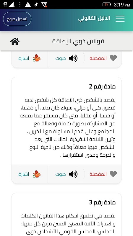 The first application to allow the definition of the laws of persons with disabilities and its executive regulations for the deaf in sign language and voice for the blind