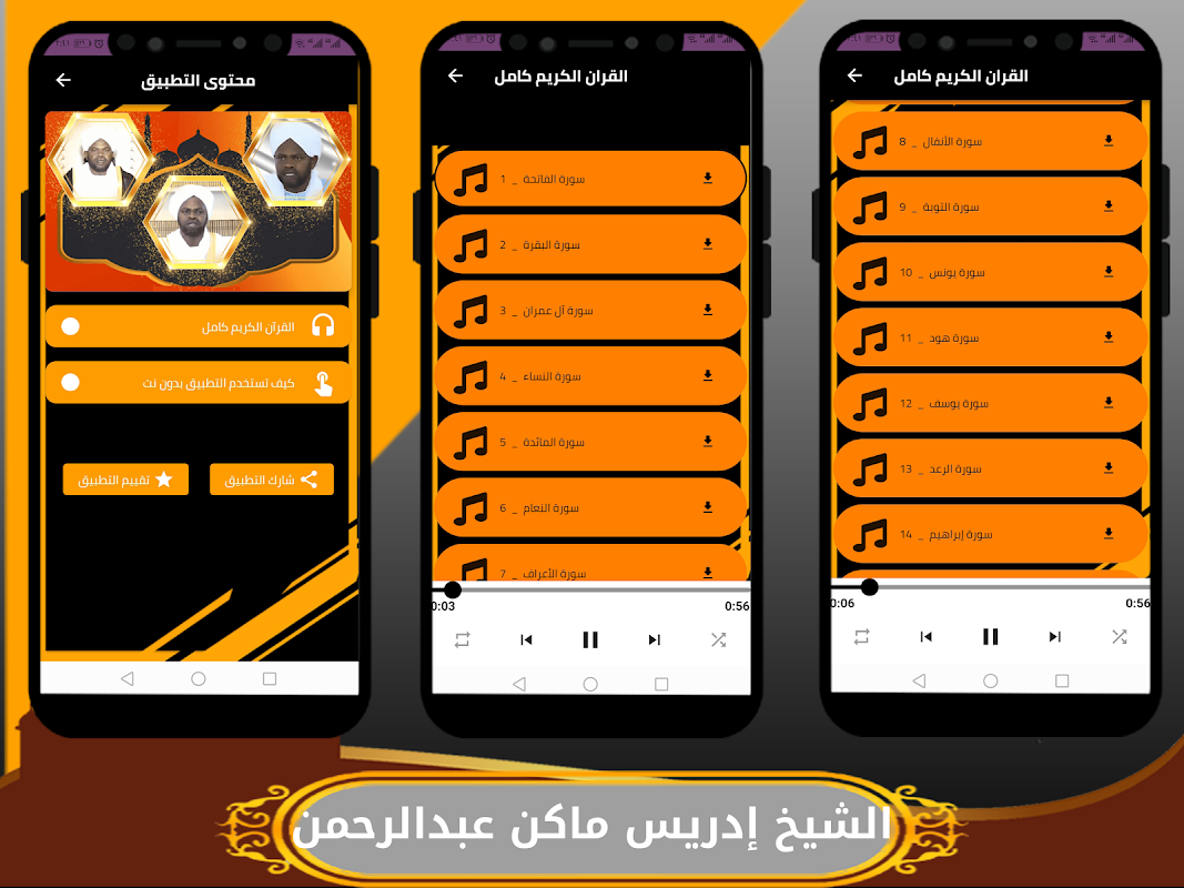The application of the Noble Qur’an with the voice of Sheikh Idris Makin allows you to hear and download the entire Holy Qur’an with the voice of Idris Makin Abdul Rahman, and you can download the Holy Qur’an to your mobile phone easily and conveniently through one application that includes the Noble Qur’an mp3 with the voice of Sheikh Idris Makin Abdul Rahman