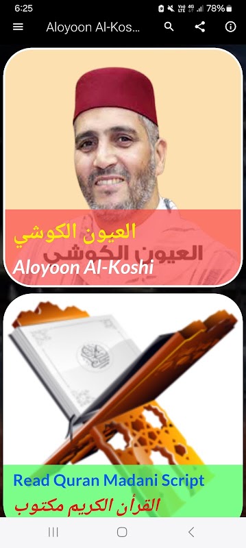 الشيخ العيون الكوشي في تلاوة للقرآن الكريم كاملا بجودة عالية وبرواية ورش عن نافع في تطبيق مميز يشتمل على مجموعة كبيرة من الوظائف الهامة كخاصية تحميل السور والاستماع الى التطبيق بدون انترنت علاوة على واجهته الانيقة والسهلة الاستعمال كما يتوفر على خصائص مشاركة التطبيق مع الغير واستعمال ملفاته كرنة هاتف أو منبه واستمرارية الاستماع لتلاوة السور في خلفية التطبيق رغم تصفح مواقع اخرى. قرأن كامل العيون الكوشي بدون نت