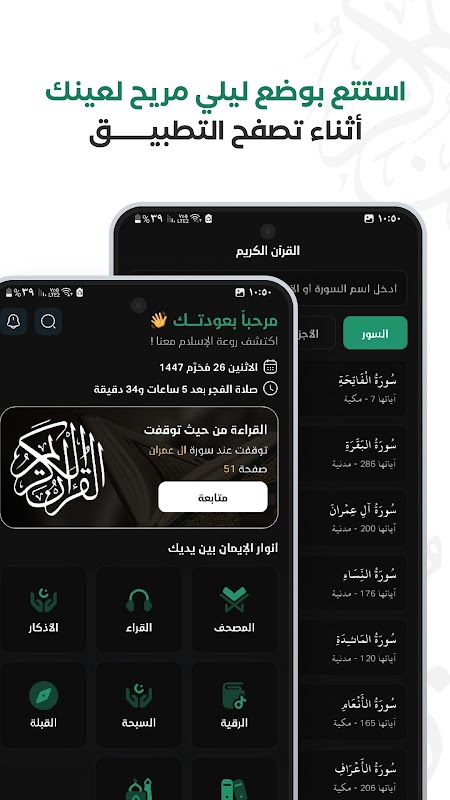 - Displaying the Holy Quran with the ability to display verses per page.