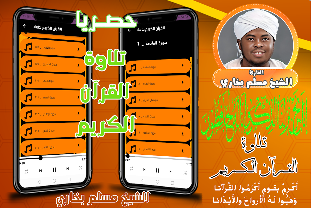 The application of the Holy Qur’an in the voice of Sheikh Muslim Bukhari allows you to hear and download the Holy Qur’an in the voice of reciter Muslim Bukhari, and you can download the Holy Qur’an to your mobile phone easily and conveniently through one application that includes recitation of the Holy Qur’an mp3 in the voice of reciter Sheikh Muslim Bukhari.