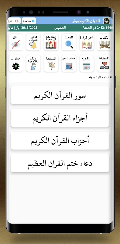 - A section dedicated to the parts of the Holy Quran for reading the entire Quran, as well as a section for the chapters