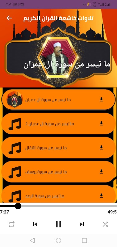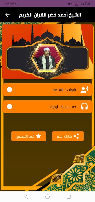 The Quran of Sheikh Khidr Ahmed Mustafa is an application that allows you to hear and download the Holy Quran in the voice of Khidr Ahmed Mustafa. You can download the Holy Quran to your mobile phone easily and conveniently through one application that provides you with the Quran of Sheikh Khidr Ahmed Mustafa and humble recitations from the Holy Quran mp3 in the voice of Khidr Ahmed Mustafa.