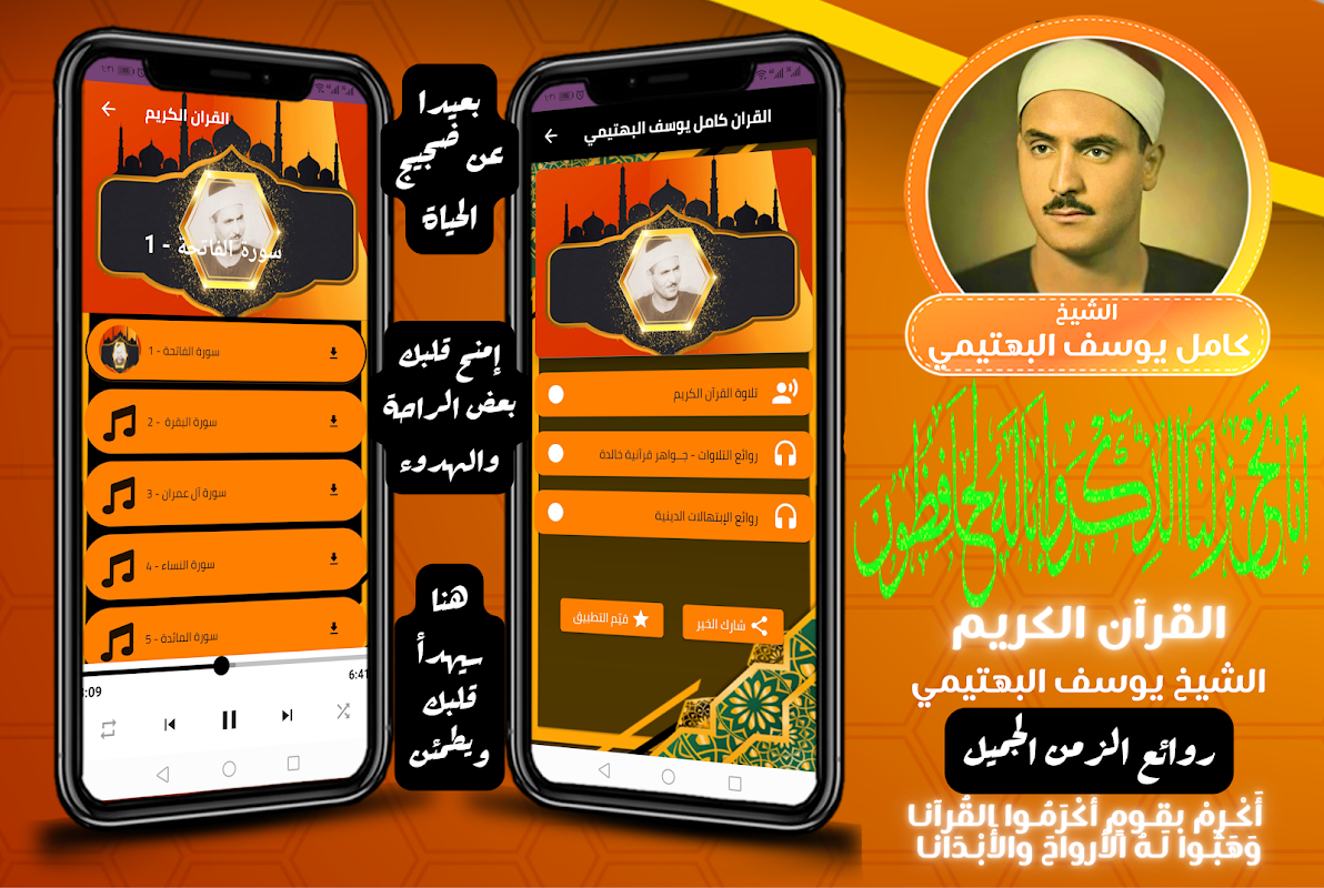 ⬅️ It is well known that Kamel Youssef El-Bahtimi has a beautiful and wonderful voice filled with tranquility and calm, transporting you to another world of serenity and psychological comfort. The voice of the reciter Youssef El-Bahtimi will undoubtedly leave a beautiful impression on you. The app will help you understand the superiority of the Holy Quran over other speech, as well as the virtue of regularly reciting and listening to the Quran. We hope that the Sheikh Kamel Youssef El-Bahtimi Quran Download app will help you with this. It will also help you download and memorize the Holy Quran with the voice of Kamel Youssef El-Bahtimi, with recitation, religious supplications, and religious chants.