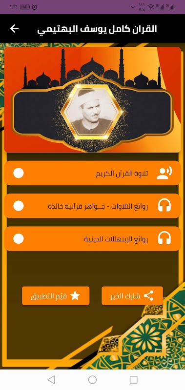 ⬅️ The interface of the Sheikh Kamel Youssef Al-Bahtimi Quran app is very simple, allowing you to use the program with ease and also to navigate between the pages of the Quran app with the voice of Youssef Al-Bahtimi, various religious supplications, and Islamic Tawashih.