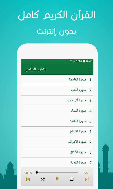 The Holy Qur’an is complete in the voice of Sheikh Mishary Al-Afasy, without the Internet, offering you a distinctive listening experience with humble recitation and pure voice. The Al-Afasy application allows you to complete the Holy Quran without the Internet in high quality, while listening to all the surahs of the Holy Quran even when you close or exit the application.