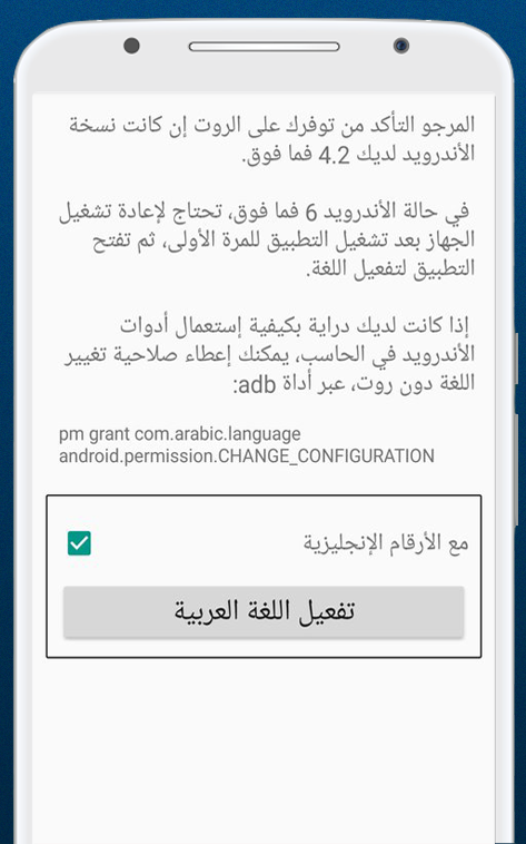 بالنسبة لرومات الأندرويد 4.2 فما فوق تحتاج للروت أو إن كنت على دراية بأدوات الأندرويد يمكنك إستعمال أداة adb لإعطاء تصريح تفعيل اللغة CHANGE_CONFIGURATION.