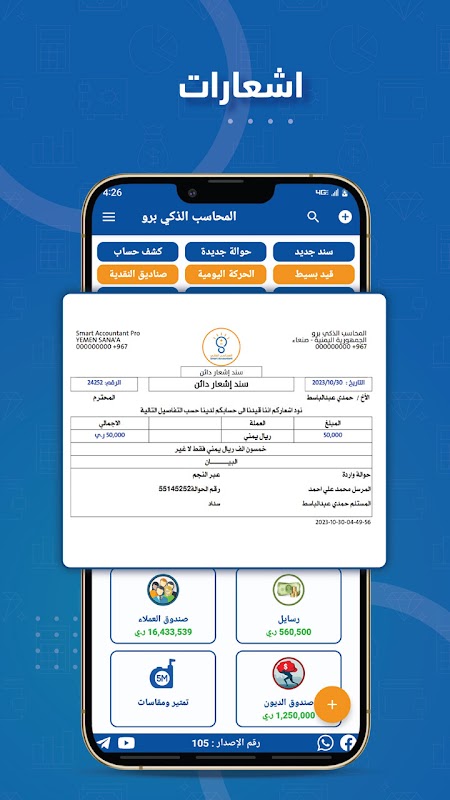 Boxes - accounts - bonds - invoices and stores - reports - printing - instant messages currencies and sizes