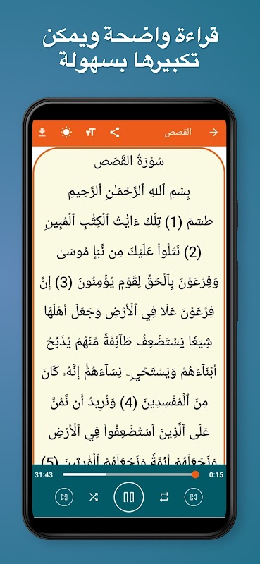 Audio recitation: The ability to listen to the recitation of the Holy Quran in the voice of famous reciters, allowing users to better understand the verses and enjoy the linguistic beauty.