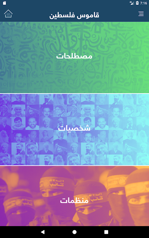 قاموس فلسطين: يحتوي التطبيق علي أكثر من خمسين مصطلح و تعريف كمرحلة أولي، إلي ان يصل عدد المصطلحات و التعريفات الي مئتين، و ستكون متاحة فقط في هذا التطبيق.