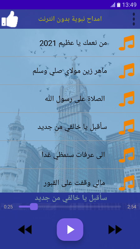 أدخِل ملاحظات اتطبيق امداح نبوية بدون انترنت يقدم لك مجموعة من الأمداح النبوية المختارة بعناية لتستمع إليها في أي وقت ومن دون الحاجة إلى الاتصال بالإنترنت.