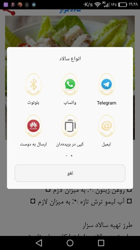 * امکان اشتراک گذاری و ارسال دستور آشپزی از طریق ایمیل ، پیامک و شبکه های اجتماعی نظیر تلگرام ، وایبر ، واتساپ ، لاین و ...