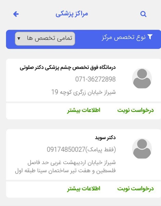 با این اپلیکیشن مراجعه کنندگان به مراکز درمانی می توانند براحتی مراکز درمانی و پزشکان را جستجو کنند. همچنین با قابلیت نوبت دهی دسترسی به این مراکز آسان می شود. هر بیمار قادر به بارگذاری 10 مدرک پزشکی برای پزشکان است.