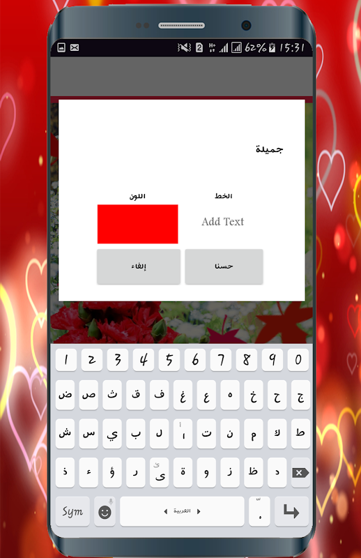 هل تبحث عن برنامج تعديل الصور كتابة بالخط العربي ? - هل شاهدت أحد أصدقائك قد قام بالكتابة على اصورته و تريد ذلك ? هل تريد الكتابة على الصور كتابة اسمك أو اسم حبيبك الخط العربي على صورك طريقة عمل ذلك بسيطة ولا تحتاج لأي خبرة إضافة ملصقات والنص على صورك فتطبيق إطارات حب ورومانسية دون انترنت تعديل الصور كتابة بالخط العربي بخطوط مختلفة ورائعة سيوفر لك ذلك بكل سهولة.