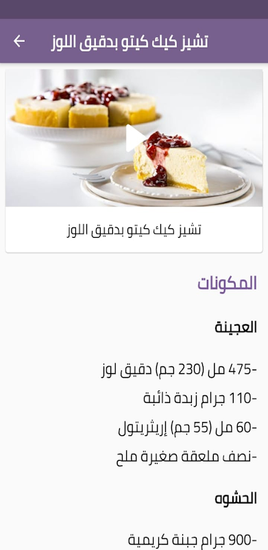 كما يقدم التطبيق طريقة عمل تشيز كيك كيتوني موضحة بالصور وبعضها بالفيديو