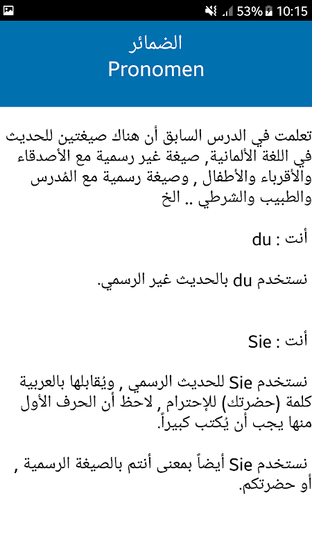 يسهل عليك التطبيق تعلم اللغة الألمانية بشكل ذاتي. لإستفادة أكبر يُنصح بدراسة كتاب منهجي بجانب التطبيق مثل صچهريتتي ىنتيرناتيونال أو Bيعيعنونعين وغيرها.