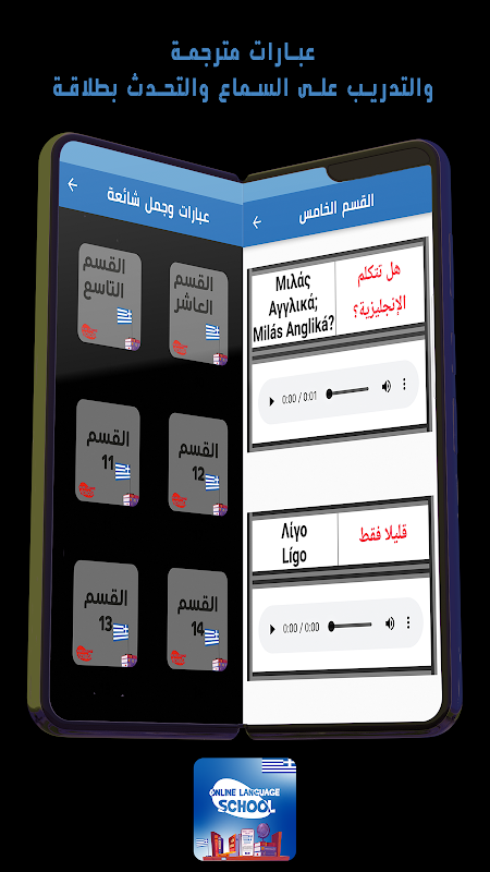 Third: Common Greek sentences and expressions, which are more than 1000 renewed sentences divided into several levels and with varying degrees of difficulty Suitable for beginners and advanced inclusive of all topics used in public life Supported by translation and audio to facilitate study