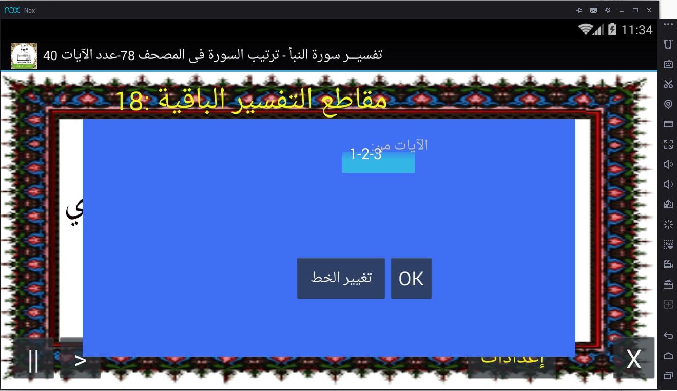لتحديد الايات المطلوب عرض التفسير لها وحجم الخط ونوعه أختر (إعدادات)