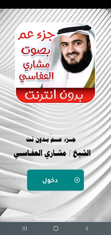 The application of the Holy Qur’an, Juz Amma, recited by Sheikh Mishary Al-Afasy without the Internet, works on all Android devices without using any Wi-Fi network or the Internet after downloading it from the Google Play Store.