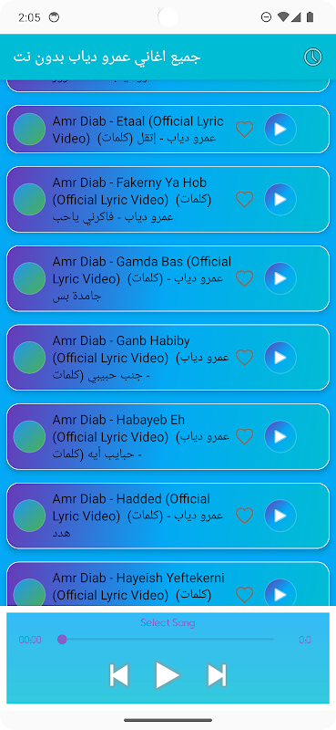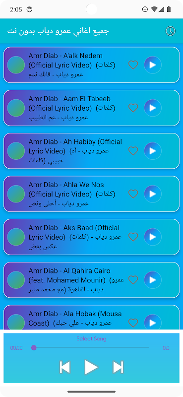 The "All Amr Diab Songs Without the Internet" application brings together a distinguished library of old and new songs by the artist Amr Diab, which you can listen to anytime and without an internet connection. Whether you're a fan of romantic or rhythmic songs, this application provides you with a complete musical experience with clear sound and excellent quality.
