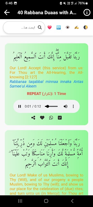 ✔️ Quran memorization tool where you can listen to The Holy Quran in different repetition modes to memorize Quran. This feature is important for students and teachers of Quran.
