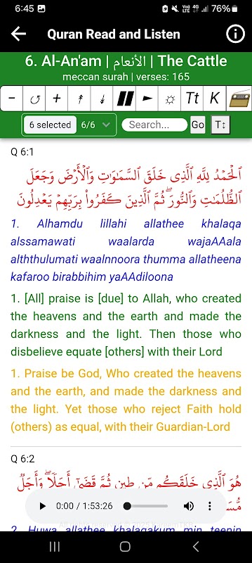✔️ Quran reading and listening on the single-page (no need to switch back and forth between activities), pause the recitation, carefully study the written Quranic verses/ayats, or change the playback speed of the Quran audio.