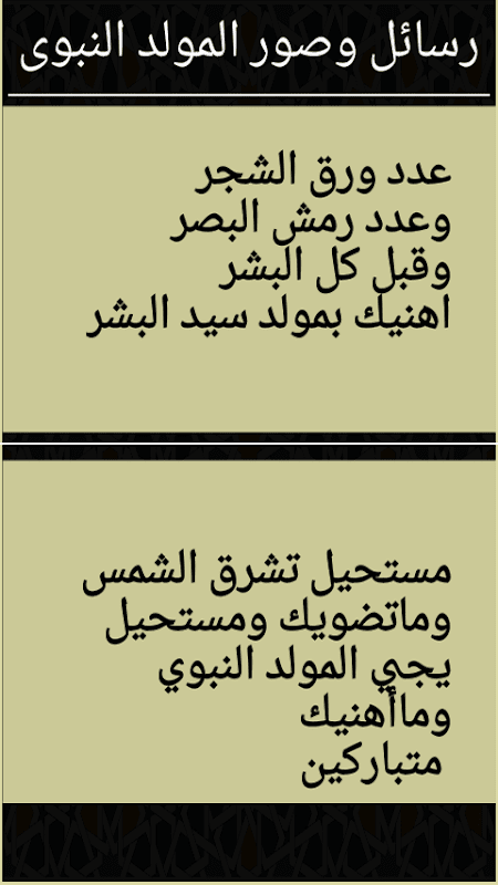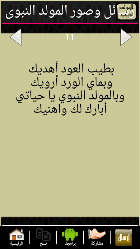 يحل علينا هذة الايام يوم مولد الرسول الكريم محمد علية الصلاة و السلام فهذا اليوم هو ذكرى مولد الرسول الكريم الذى يحتفل بة اكثر من مليار و نصف مسلم حول العالم ليحيوى يوم مولد الرسول محمد علية صلوت الله هذا اليوم الذى اشرقت فية الارض ب ميلاد الرسول الكريم علية السلام لذلك اعددنا لكم تطبيق مولد الرسول لكى تشاركو اصدقائكم و احبابكم برسائل التهنئة و بطاقات المعايده رسائل معايدة المولد النبوى الشريف لنذكر و نصلى و نحتفل بذكرى ميلاى خير البشر اجمعين راجين الله ان يجمعتا بة و سائر المسلمين عند حوض المصطفى عيلة الصلاة و السلام