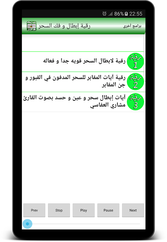 يحتوي تطبيق رقية إبطال وفك السّحر قراءة صوتية لايات القرآن الكريم بصوت اشهر قراء العالم (مشاري العفاسي - نبيل العوضي - سعد الغامدي - محمد الجوراني ) كذلك رقية الشرعية للاطفال هادا تطبيق بدون انترنيت