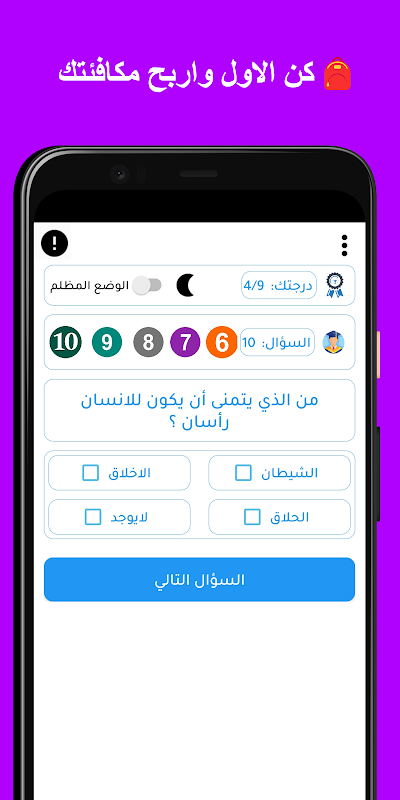 A question and answer application for cultural competitions and general culture that contains many diverse fields, and each knowledge field contains several levels, including easy questions and answers, others difficult questions and answers, and general information, in addition to that each level contains 10 questions. For each question there are four choices, only one of which is correct. And to develop your general culture, he corrects the answer for you before passing on to the next question.