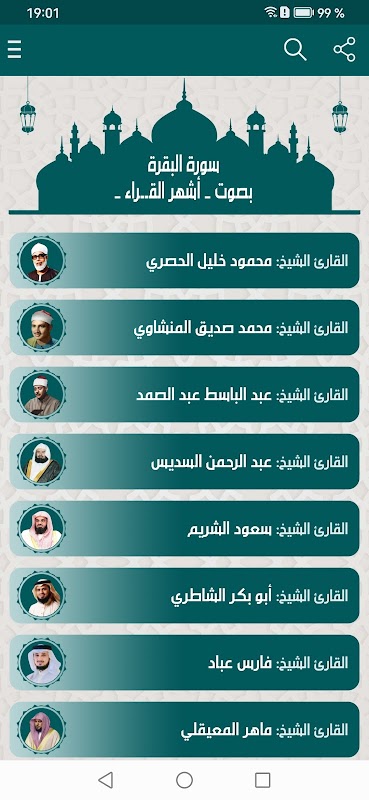 The application also contains the most famous reciters reciting Surat Al-Baqarah, this great surah, in their beautiful and distinctive voice. Among these famous reciters we find in the application all of:
