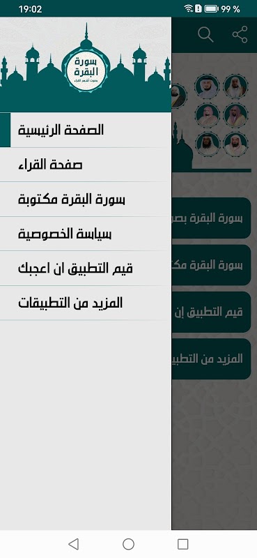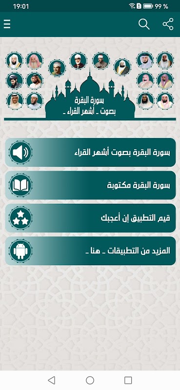 Through a diverse group of more than 15 Holy Quran reciters who are considered some of the most famous sheikhs and reciters of the Holy Quran, users can listen to recitations of Surat Al-Baqarah that elevate the spirit and deepen faith. Regardless of personal preferences, users can choose the reciter they find most influential or closest to a recitation style that suits them. With high sound quality and quick response to navigate between verses and pages of Surat Al-Baqarah, this application provides an enjoyable and convenient experience for those who want to listen to or read Surat Al-Baqarah at any time. And anywhere via their smartphones, choosing their favorite reader.