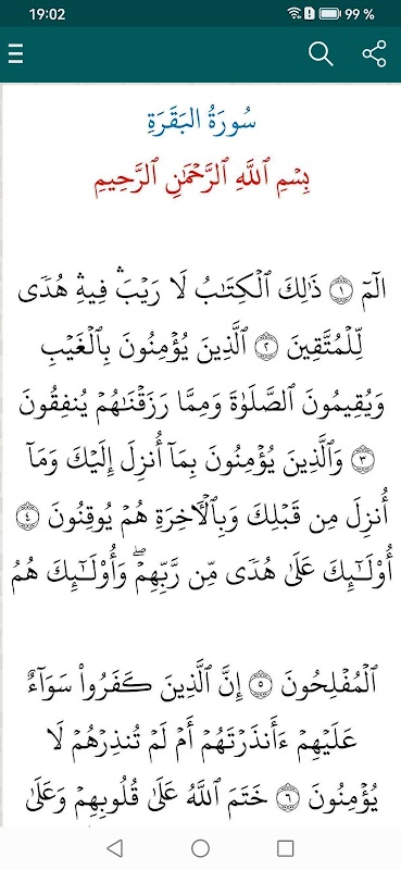 The application features a simple and easy-to-use user interface, which allows users to easily browse Surat Al-Baqarah without the internet and quickly access their favorite verses. The application also provides the feature of visual reading of the surah, which enables those wishing to read the Qur’anic text of Surat Al-Baqarah with a clear and melodious recitation.