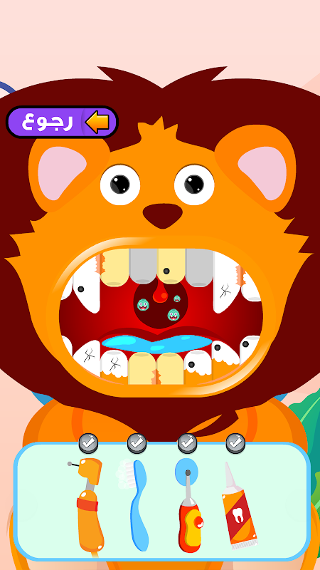 لعبة طبيب الاسنان بيطري الحيوانات يحتوي على خصوصيات تساعد المستعمل على معرفة تقدمه من حيث الاشارة الى الاداة التي لم تعد بالحاجة اليها كما تشير اللعبة الى طريقة استعمال الاداة المستعملة