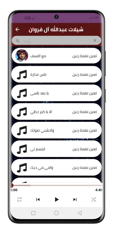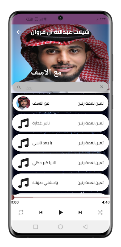 The Abdullah Al Farwan 2023 chelated application without the net enables you to hear Abdullah Al Farwan's hail from abroad, by running Abdullah Al Farwan's chelated songs, exiting the application and browsing other applications.