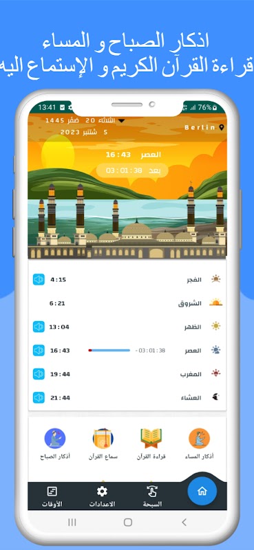 “Prayer times in Germany” is a simple application that contains many features and characteristics, including prayer times for Muslims, morning and evening remembrances, listening and reading the Holy Quran, Hijri date, Qibla direction, Hajj, Ramadan and fasting.