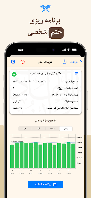 • امکان تنظیم زمان یادآوری برای قرائت روزانه قرآن مجید