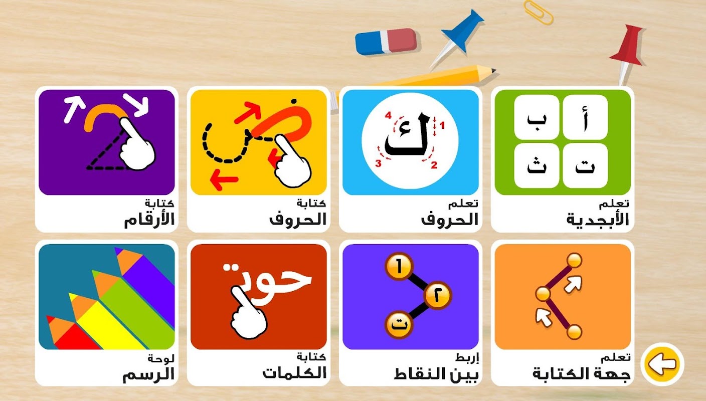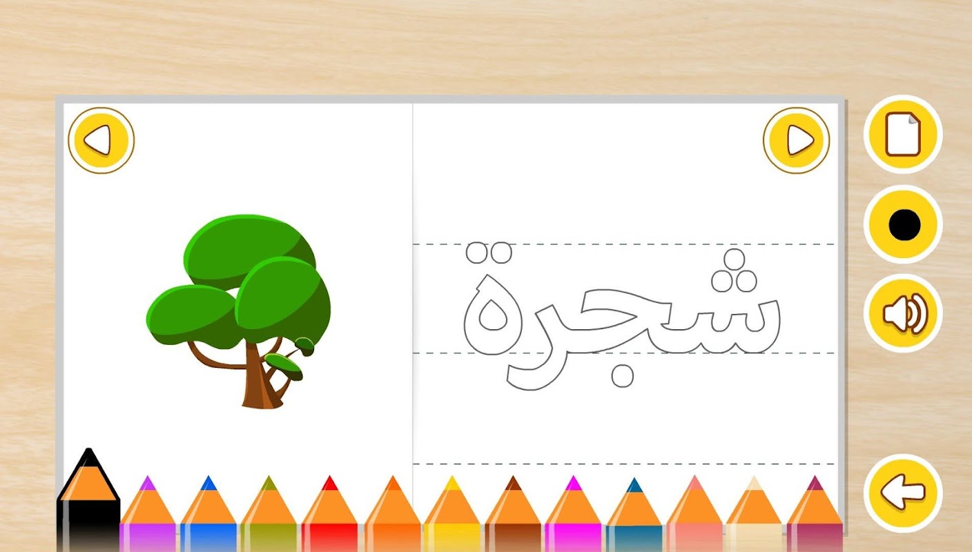تعلم كتابة الحروف : يوفر التطبيق برنامج متكامل لتعلم كتابة الحروف حيث يمكن للمستعمل الكتابة مباشرة على الشاشة باستعمال يده او باستعمال قلم خاص بالشاشات اللوحية ، كما تعطي امكانية تغيير لون الخط ، سمك الخط ، تعلم طريقة و جهة الكتابة و مباشرة سماع نطق الحرف ،